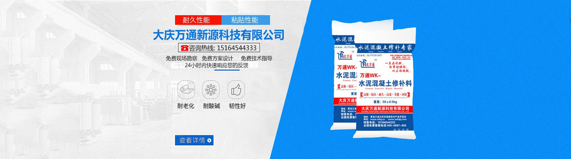 大慶萬通新源科技有限公司獨有的混凝土路面高強速補料,是水泥混凝土路面病害修復的好材料。疲勞、凍融循環(huán)、彎曲壓力、滲水和基層破壞等原因都會引起水泥路面的破損,從而帶來高昂的維護費用。與以往的剛性修補方法不同,混凝土水泥路面維修速補膠提供了一種獨特的柔性修補產品和技術,高柔性、高抗拉性,可跨伸縮縫施工和高抗壓性使得混凝土快補產品為水泥混凝土路面提供了******性的修補。傳統的剛性修補方案,如環(huán)氧砂漿和快干水泥產品,由于其自身的粘結失效,抗疲勞性低以及與原路面不同的伸縮系數,修補面會在短時間內失效或產生新的裂縫,需要反復修補,有效期短且費用高昂。大慶萬通新源科技有限公司的混凝土水泥路面維修速補膠可以隨原路面一起伸縮,移動,從而避免了粘結失效和產生新裂縫。萬通快補產品優(yōu)異的粘結性、柔韌性和高防滑性,特別適用于水泥路面的淺層粘合修補,多邊角混凝土板層修補,跨伸縮縫修補以及路面沉陷修補。萬通混凝土病害修補料針對混凝土起皮起沙、斷板裂縫、蜂窩麻面、坑槽露石子、漏筋掉皮、橋梁的掉皮漏筋快速通車使用時間長。應用萬通快補產品,施工后一天就可以恢復交通。大慶萬通新源科技有限公司的萬通水泥路面維修速補膠適用于高速公路、機場路面、農村村村通路面、廠坪、學校操場、市區(qū)公路、小區(qū)路面、橋梁、水泥路面的修補。使用萬通特快補材料修補路面可以一勞永逸! 水泥地面起砂怎么辦,混凝土修補劑混凝土地面起砂,混凝土地面修補,地面起砂怎么辦,